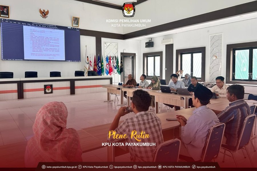 Rapat Pleno Rutin KPU Kota Payakumbuh kembali digelar pada Senin, 22 September 2025 dengan dihadiri komisioner, sekretaris, kasubbag, pejabat fungsional, serta staf. Dalam pleno kali ini, ditetapkan laporan tahapan Pemilu dan Pemilihan Serentak 2024 serta dilanjutkan progres dokumentasi tahapan teknis. Selain itu, disepakati bahwa penandatanganan Surat Pernyataan Bebas Benturan Kepentingan akan dilaksanakan pada Selasa, 23 September 2025 pukul 10.00 WIB.