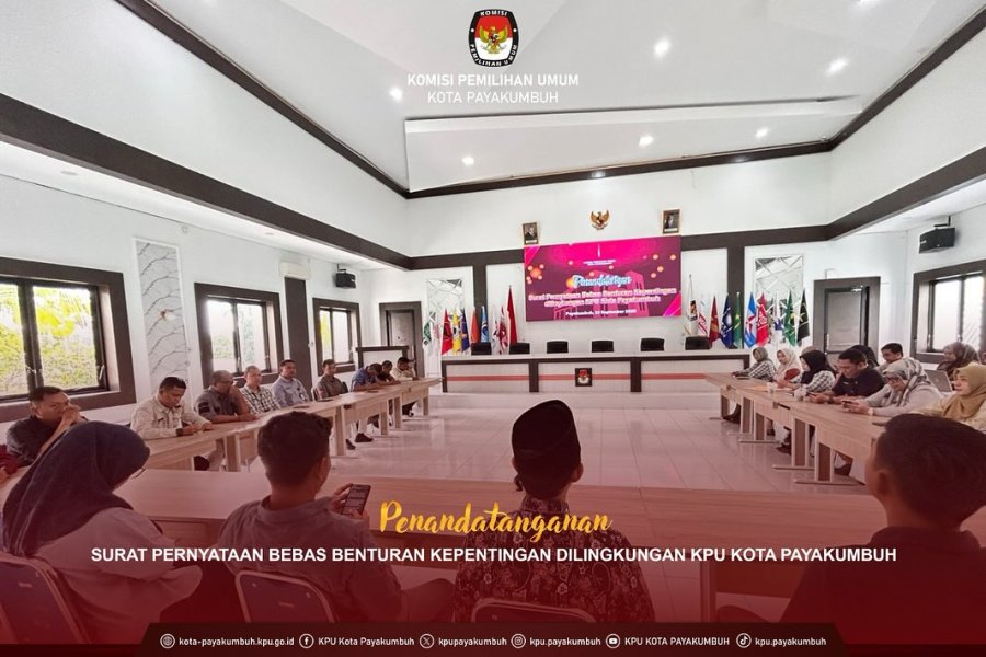 Penandatanganan Surat Pernyataan Bebas Benturan Kepentingan dilaksanakan KPU Kota Payakumbuh pada Selasa, 23 September 2025 pukul 10.00 WIB. Kegiatan ini diikuti oleh Anggota KPU, Sekretaris, serta seluruh jajaran sekretariat KPU Kota Payakumbuh.