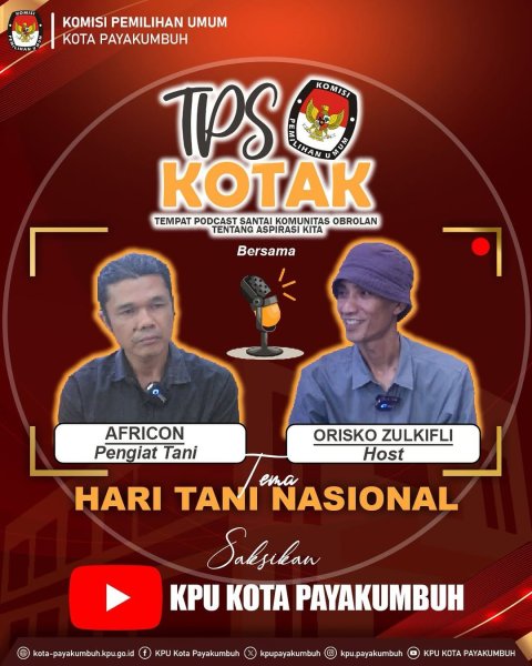 Dalam rangka memperingati Hari Tani Nasional pada 24 September 2025, KPU Kota Payakumbuh menghadirkan obrolan santai melalui podcast TPS KOTAK (Tempat Podcast Santai Komunitas Obrolan Tentang Aspirasi Kita).