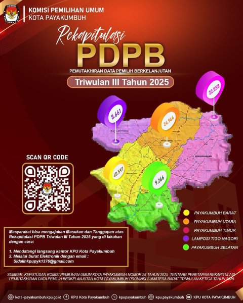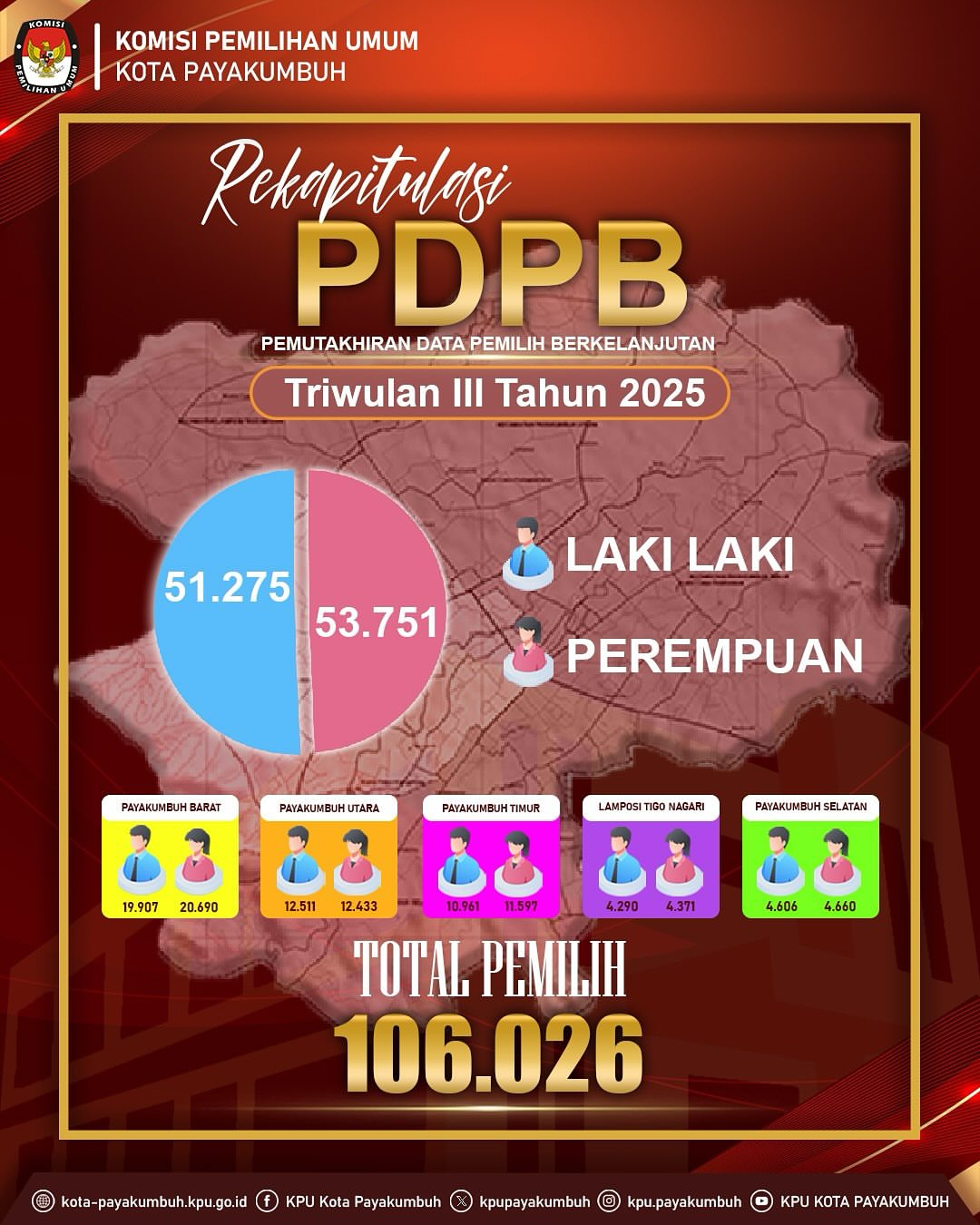 Payakumbuh, Oktober 2025 — Komisi Pemilihan Umum (KPU) Kota Payakumbuh telah menyelesaikan kegiatan Pemutakhiran Data Pemilih Berkelanjutan (PDPB) Triwulan III Tahun 2025. Berdasarkan hasil rekapitulasi, tercatat total 106.026 pemilih yang terdiri atas 51.275 pemilih laki-laki dan 53.751 pemilih perempuan, kegiatan pemutakhiran data pemilih berkelanjutan ini merupakan bagian dari upaya KPU untuk menjaga akurasi dan validitas daftar pemilih.