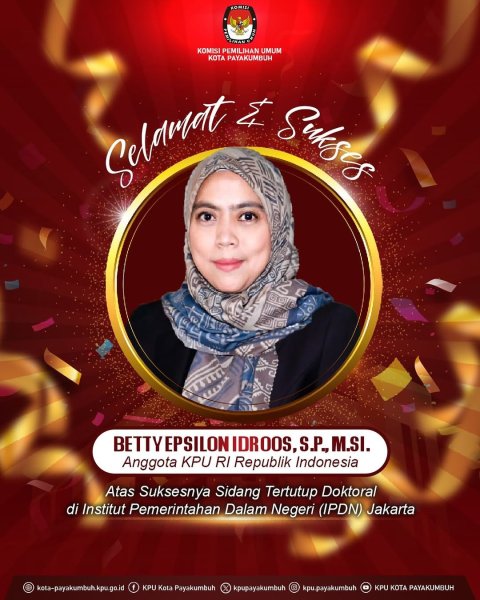 KPU Kota Payakumbuh mengucapkan Selamat dan Sukses kepada Ibu Betty Epsilon Idroos, S.P., M.Si., Anggota KPU Republik Indonesia, atas keberhasilan meraih gelar Doktor melalui Sidang Tertutup di Institut Pemerintahan Dalam Negeri (IPDN) Jakarta, pada 29 Oktober 2025.