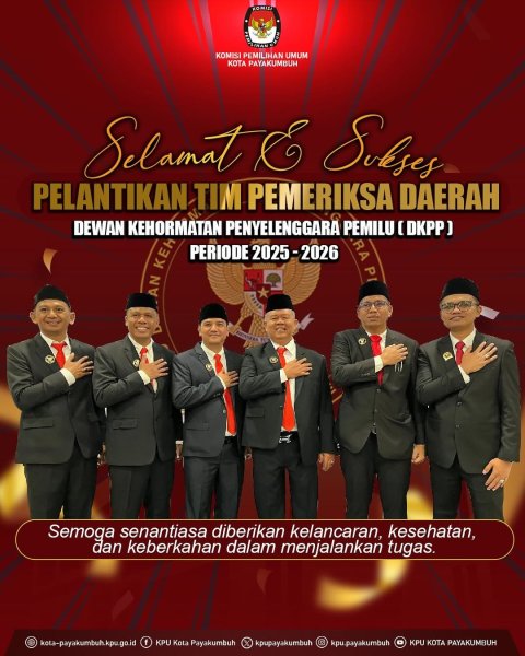 KPU Kota Payakumbuh mengucapkan Selamat dan Sukses atas Pelantikan Tim Pemeriksa Daerah (TPD) Dewan Kehormatan Penyelenggara Pemilu (DKPP) untuk Periode 2025–2026.