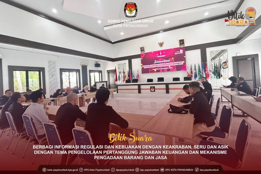 Rabu, 12 November 2025, Komisi Pemilihan Umum (KPU) Kota Payakumbuh menyelenggarakan kegiatan Bilik Suara Edisi Keempat yang diikuti oleh Ketua, Anggota, serta seluruh jajaran Sekretariat KPU Kota Payakumbuh. Kegiatan ini berlangsung dalam suasana interaktif dengan mengangkat tema “Pengelolaan Pertanggungjawaban Keuangan dan Mekanisme Pengadaan Barang dan Jasa.”