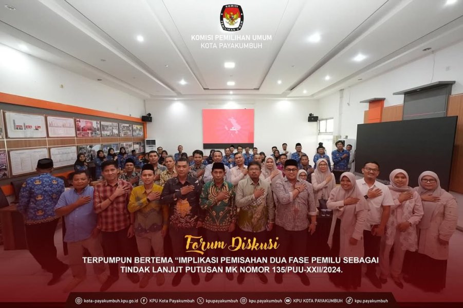 Senin, 17 November 2025, KPU Kota Payakumbuh menghadiri undangan KPU Provinsi Sumatera Barat perihal Forum Diskusi Terpumpun bertema “Implikasi Pemisahan Dua Fase Pemilu sebagai Tindak Lanjut Putusan MK Nomor 135/PUU-XXII/2024.” Kegiatan ini menghadirkan Anggota KPU RI, Idham Holik, sebagai narasumber.