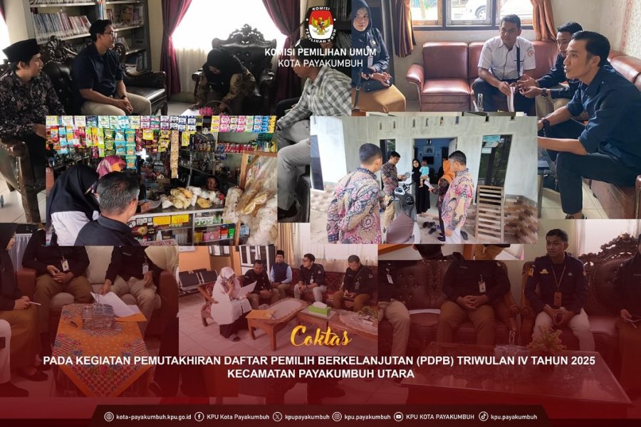 Rabu, 19 November 2025, Komisi Pemilihan Umum (KPU) Kota Payakumbuh mulai melaksanakan kegiatan Pencocokan dan Penelitian Terbatas (Coktas) dalam rangka Pemutakhiran Data Pemilih Berkelanjutan (PDPB) Triwulan IV. Kegiatan ini dilaksanakan di Kecamatan Payakumbuh Utara.
