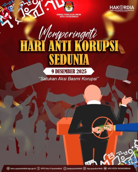Dalam rangka memperingati Hari Anti Korupsi Sedunia, KPU Kota Payakumbuh mengajak seluruh elemen masyarakat untuk terus meneguhkan komitmen menjaga integritas dan menolak segala bentuk praktik korupsi dalam kehidupan bermasyarakat, berbangsa, dan bernegara. Peringatan ini menjadi momentum refleksi bersama bahwa korupsi merupakan ancaman serius terhadap keadilan, kepercayaan publik, dan kualitas demokrasi.