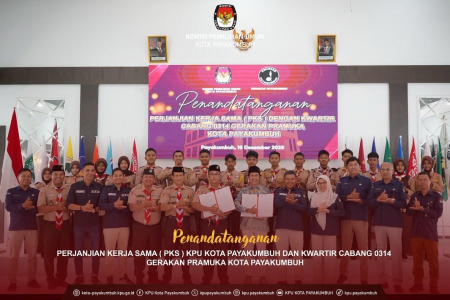 KPU Kota Payakumbuh secara resmi menandatangani Perjanjian Kerja Sama (PKS) dengan Kwartir Cabang 0314 Gerakan Pramuka Kota Payakumbuh pada Selasa, 16 Desember 2025, bertempat di Aula HKM KPU Kota Payakumbuh. Kegiatan ini dihadiri oleh Ketua dan Anggota KPU Kota Payakumbuh, Pelaksana Harian Sekretaris, jajaran Sekretariat KPU Kota Payakumbuh, serta pengurus Kwartir Cabang 0314 Gerakan Pramuka Kota Payakumbuh.