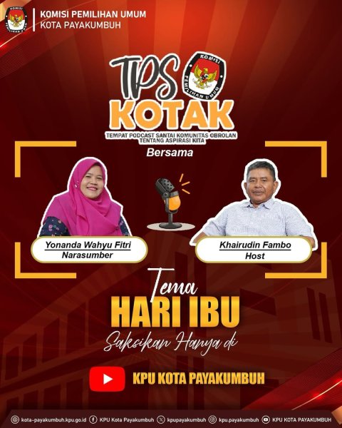 Dalam rangka memperingati Hari Ibu, KPU Kota Payakumbuh menghadirkan edisi khusus podcast TPS KOTAK (Tempat Podcast Santai Komunitas Obrolan Tentang Aspirasi Kita) sebagai ruang diskusi dan refleksi bersama.