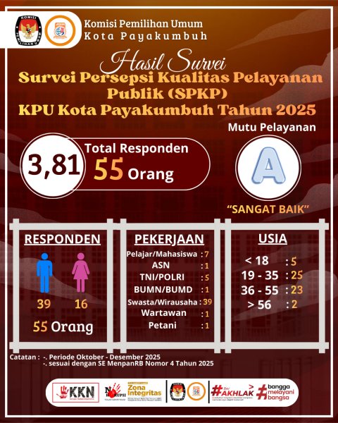 KPU Kota Payakumbuh menyampaikan Laporan Hasil Survei Persepsi Kualitas Pelayanan (SPKP) Tahun 2025 yang dilaksanakan pada periode Oktober sampai dengan Desember 2025. Survei ini merupakan wujud komitmen KPU Kota Payakumbuh dalam memberikan pelayanan publik yang prima, profesional, dan akuntabel.