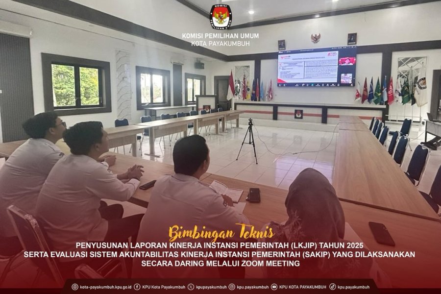 Pada Senin, 29 Desember 2025, KPU Kota Payakumbuh mengikuti Bimbingan Teknis Penyusunan Laporan Kinerja Instansi Pemerintah (LKjIP) Tahun 2025 serta Evaluasi Sistem Akuntabilitas Kinerja Instansi Pemerintah (SAKIP) yang dilaksanakan secara daring melalui Zoom Meeting.