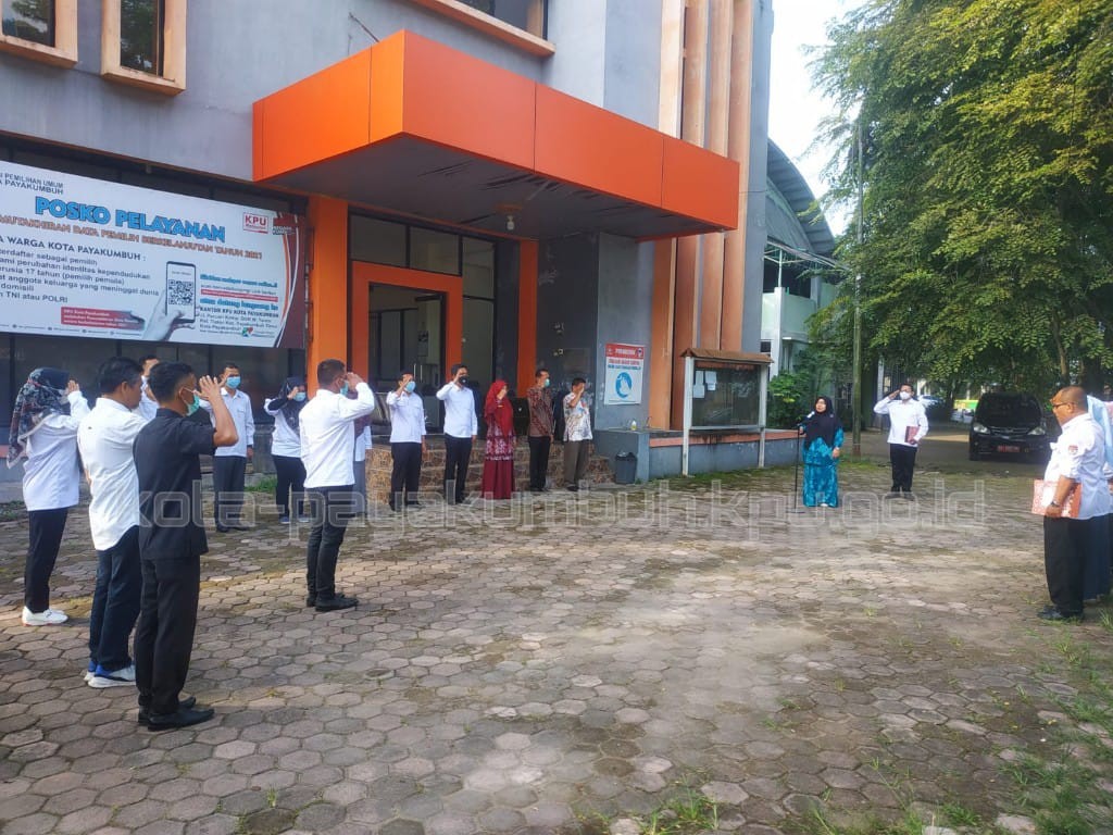 Payakumbuh --- Komisi Pemilihan Umum (KPU) Kota Payakumbuh melaksanakan apel pagi, Senin (09 Mei 2022) di halaman Kantor KPU Kota Payakumbuh. Apel perdana pasca cuti bersama Hari Raya Idul Fitri 1443 Hijriah/2022 Masehi ini dihadiri oleh Ketua dan Anggota KPU Kota Payakumbuh, sekretaris, kepala sub,bagian, pejabat fungsional, dan seluruh staf sekretariat KPU Kota Payakumbuh. Bertindak sebagai pembina apel anggota KPU Kota Payakumbuh Divisi Sosialisasi, Pendidikan Pemilih, Partisipasi Masyarakat dan Sumber Daya Manusia Nina Trisna.