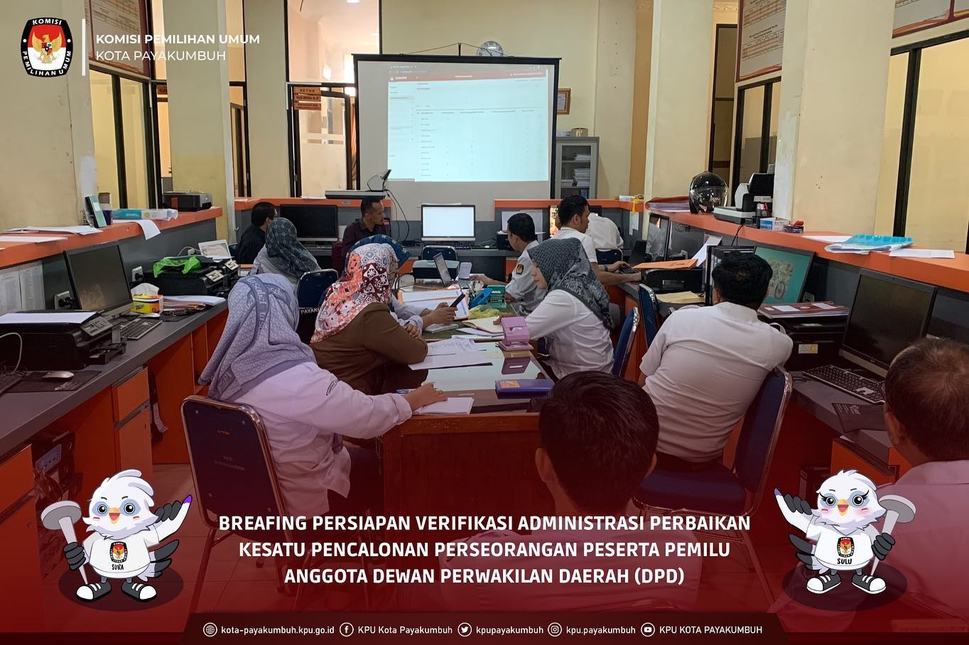 Payakumbuh --- Menjelang dilaksanakannya verifikasi administrasi perbaikan kesatu pencalonan perseorangan peserta Pemilu anggota Dewan Perwakilan Daerah (DPD), KPU Kota Payakumbuh melaksanakan breafing tim verifikator, Kamis (26 Januari 2023) jam 10.30 WIB sampai selesai.