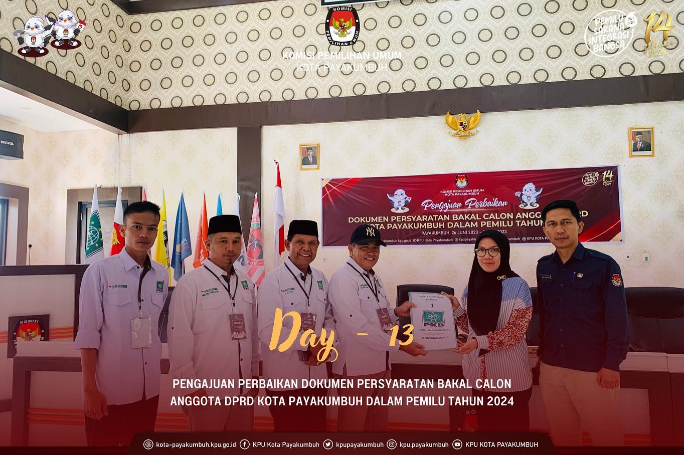 Pada hari ke-13 Pengajuan Perbaikan Dokumen Persyaratan Bakal Calon Anggota DPRD Kota Payakumbuh dalam Pemilu Tahun 2024, Sabtu (8 Juli 2023), Partai Kebangkitan Bangsa (PKB) dan Partai Persatuan Pembangunan (PPP) menyerahkan dokumen formulir Model B-DAFTAR-BAKAL.CALON.PERBAIKAN-PARPOL dan dilampiri dengan dokumen persetujuan pengajuan bakal calon dari DPP PKB.