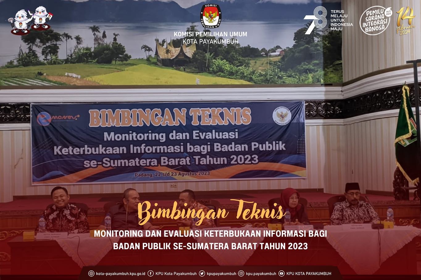 Padang --- Komisi Informasi Provinsi Sumatera Barat menyelenggarakan Bimbingan Teknis Monitoring dan Evaluasi Keterbukaan Informasi bagi Badan Publik se-Sumatera Barat Tahun 2023, Rabu (23 Agustus 2023) di Aula Kantor Gubernur Sumatera Barat. Bimtek, antara lain: KPU Kabupaten/Kota se Sumatera Barat, Bawaslu Kabupaten/Kota se Sumatera Barat, Pengadilan Tinggi Kabupaten/Kota se Sumatera Barat, dan Pengadilan Tinggi Agama Kabupaten/Kota se Sumatera Barat. Perwakilan dari KPU Kota Payakumbuh diikuti oleh Kasubag Teknis Penyelenggaraan Pemilu, Partisipasi dan Hubungan Masyarakat M. Luthfi Munzir.