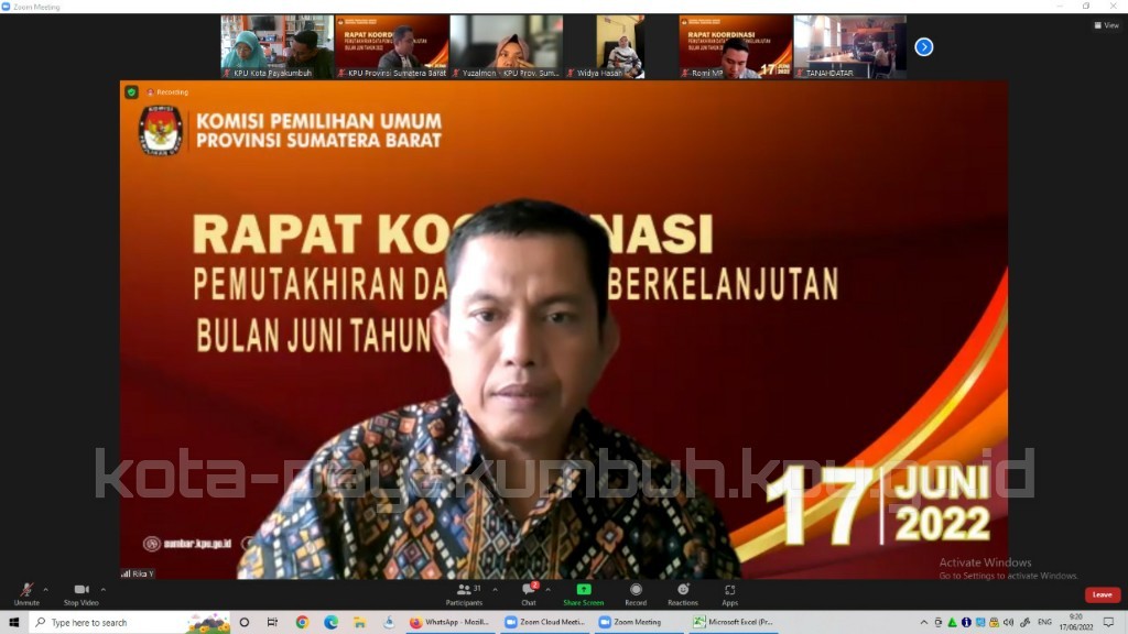 Payakumbuh -- Ketua Divisi Perencanaan, Data dan Informasi (Perdatin) KPU Kota Payakumbuh, Neti Payoka dan Kasubbag Perencanaan, Data dan Informasi (Perdatin), Rori Ade Putra beserta Operator Sidalih mengikuti Rapat Kerja Sinkronisasi Data Hasil Pemadanan Data Pemilih Berkelanjutan Semester II Tahun 2021 dengan Data Kependudukan Kemendagri, yang diselenggarakan oleh KPU Provinsi Sumatera Barat melalui zoom meeting, Jum’at pagi jam 09.00 Wib (17/06).