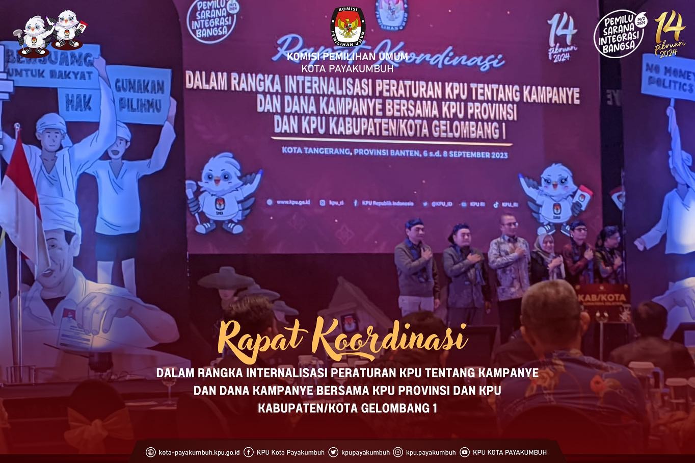 Tangerang --- KPU Kota Payakumbuh mengikuti Rapat Koordinasi dalam rangka Internalisasi Peraturan KPU tentang Kampanye dan Dana Kampanye Bersama KPU Provinsi dan KPU Kabupaten/Kota Gelombang 1, Rabu -Jumat (6-8 September 2023) di Tangerang, Provinsi Banten. Rakor diikuti oleh Ketua Divisi Teknis Penyelenggaraan Pemilu KPU Kota Payakumbuh Suci Wildanis, Ketua Divisi Sosialisasi, Pendidikan Pemilih, Partisipasi Masyarakat dan Sumber Daya Manusia Khairudin Fambo, dan Kasubag Teknis Penyelenggaraan Pemilu, Partisipasi dan Hubungan Masyarakat M. Luthfi Munzir.