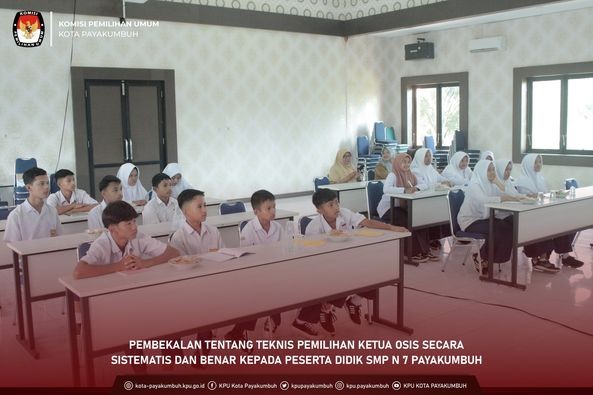 Hal itu disampaikan Ketua KPU Payakumbuh Haidi Mursal, Senin (24 Oktober 2022) pagi di hadapan perwakilan siswa SMP Negeri 7 Payakumbuh pada kegiatan Pembekalan Tentang Teknis Pemilihan Ketua OSIS Secara Sistematis dan Benar.