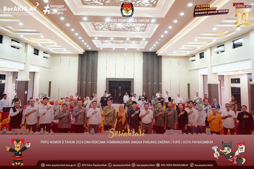 Payakumbuh --- KPU Kota Payakumbuh melakukan kegiatan sosialisasi PKPU Nomor 8 Tahun 2024 dan Rencana Pembangunan Jangka Panjang Kota Payakumbuh, Kamis (1 Agustus 2024) di Hotel Mangkuto Payakumbuh. Narasumber kegiatan ini Ketua Badan Perencanaan Pembangunan Daerah (Bappeda) Kota Payakumbuh Yasrizal dan Tim. Hadir Ketua dan Anggota KPU Kota Payakumbuh, Sekretaris, Para Pejabat Struktural dan Fungsional serta Staf Sekretariat KPU Kota Payakumbuh, Bawaslu Kota Payakumbuh, Polres Kota Payakumbuh, Kesbangpol Kota Payakumbuh, Ketua dan Sekretaris Partai Politik tingkat Kota Payakumbuh, dan wartawan.