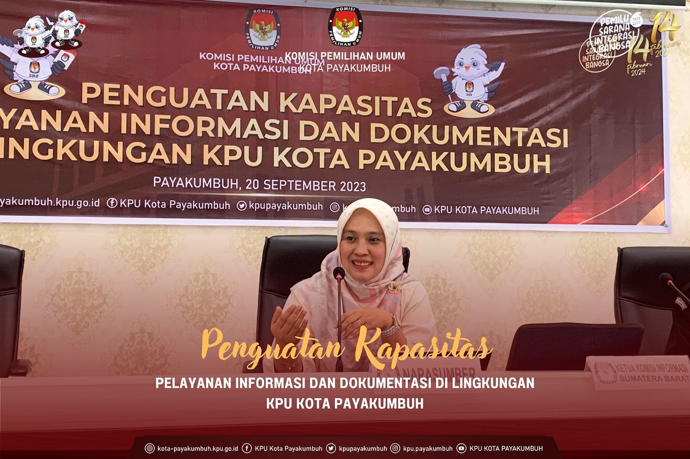 Payakumbuh --- KPU Kota Payakumbuh berkomitmen untuk terus meningkatkan pelayanan informasi dan dokumentasi di lingkungan KPU Kota Payakumbuh. Guna memperkuat dan memberikan pemahaman kepada jajaran internal, KPU Kota Payakumbuh mengadakan kegiatan Penguatan Kapasitas Pelayanan Informasi dan Dokumentasi di Lingkungan KPU Kota Payakumbuh, Rabu (20 September 2023) di Aula Kantor KPU Kota Payakumbuh.