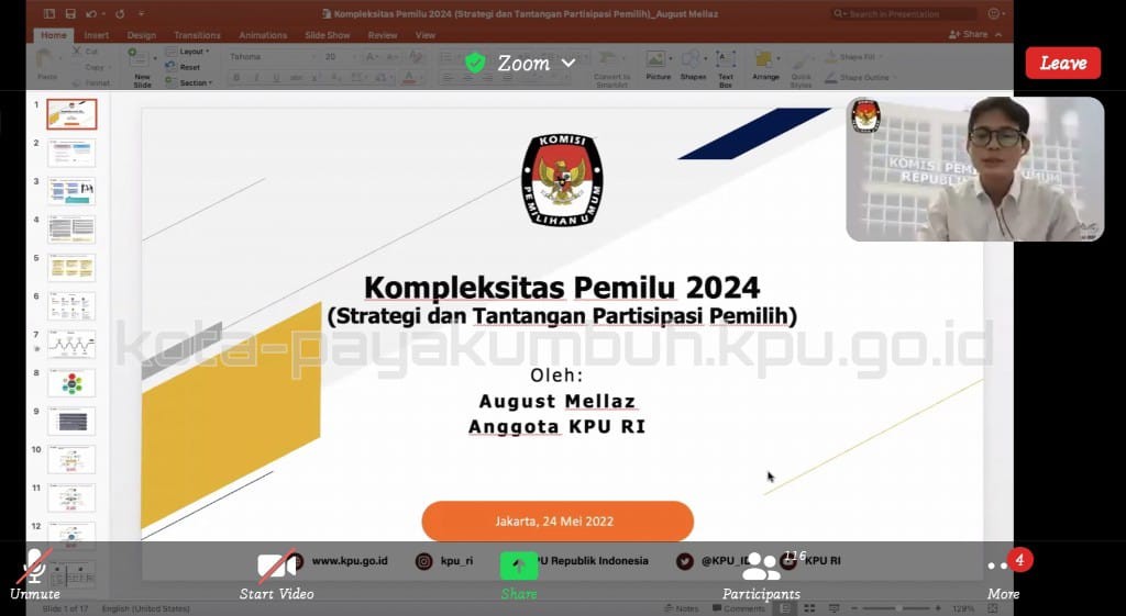 Payakumbuh --- Ada enam poin penting kompleksitas penyelenggaraan Pemilihan Umum serentak Tahun 2024. Hal itu diutarakan Anggota Komisi Pemilihan Umum (KPU) Republik Indonesia Ketua Divisi Sosialisasi, Pendidikan Pemilih dan Partisipasi Masyarakat August Mellaz pada Dialog Virtual Serial #6 #Pendidikan Pemilih yang diselenggarakan oleh KPU Provinsi Sulawesi Tengah, Selasa (24 Mei 2022) siang. Anggota KPU Kota Payakumbuh Divisi Teknis Penyelenggaraan Nofal Ardi juga mengikuti webinar ini.
