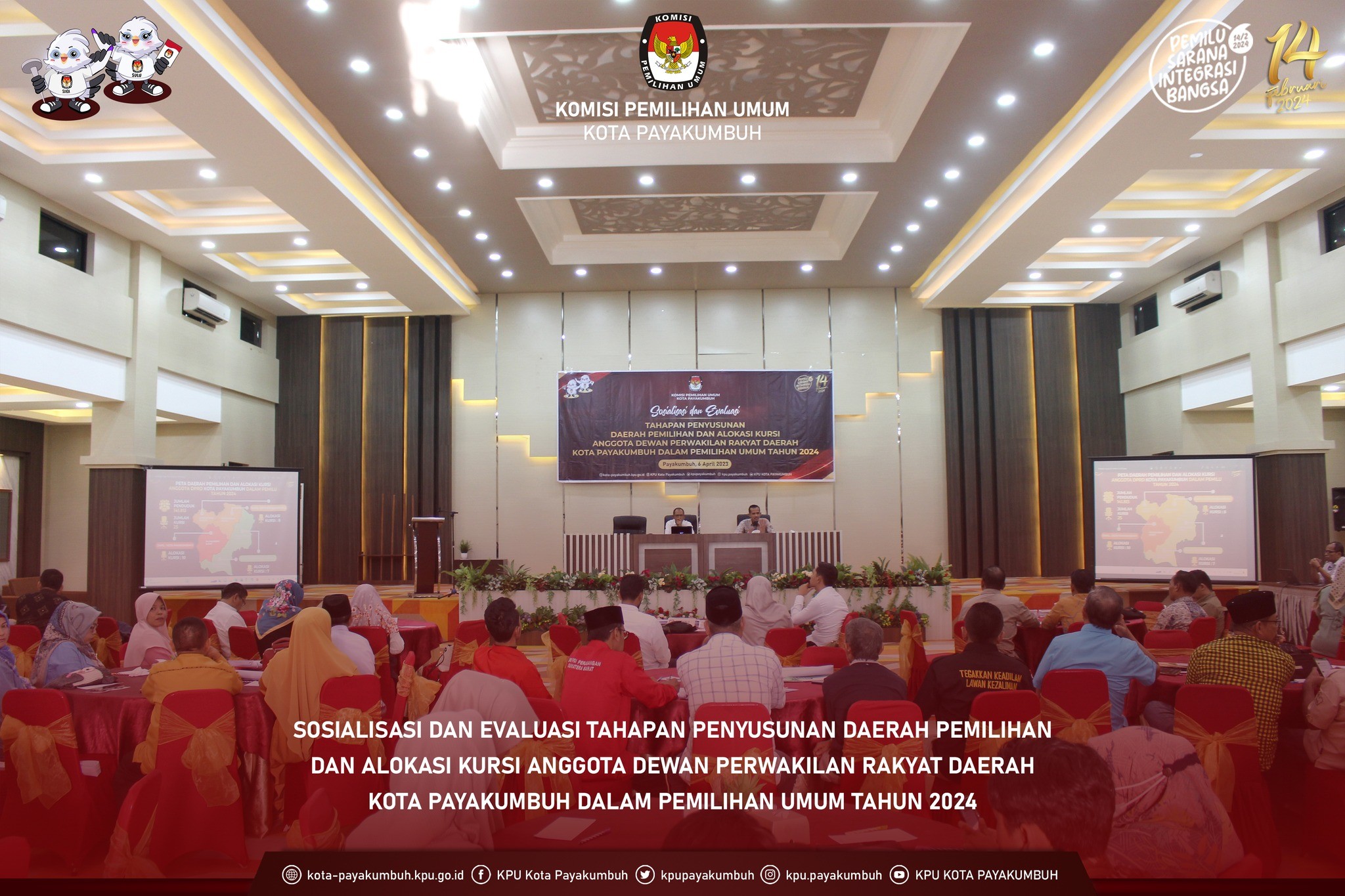 Komisi Pemilihan Umum (KPU) Kota Payakumbuh, menggelar Sosialisasi dan Evaluasi Tahapan Penyusunan Daerah Pemilihan dan Alokasi Kursi Anggota DPRD Kota Payakumbuh dalam Pemilihan Umum (Pemilu) tahun 2024, di Aula Hotel Mangkuto, Kamis, (6/4).
