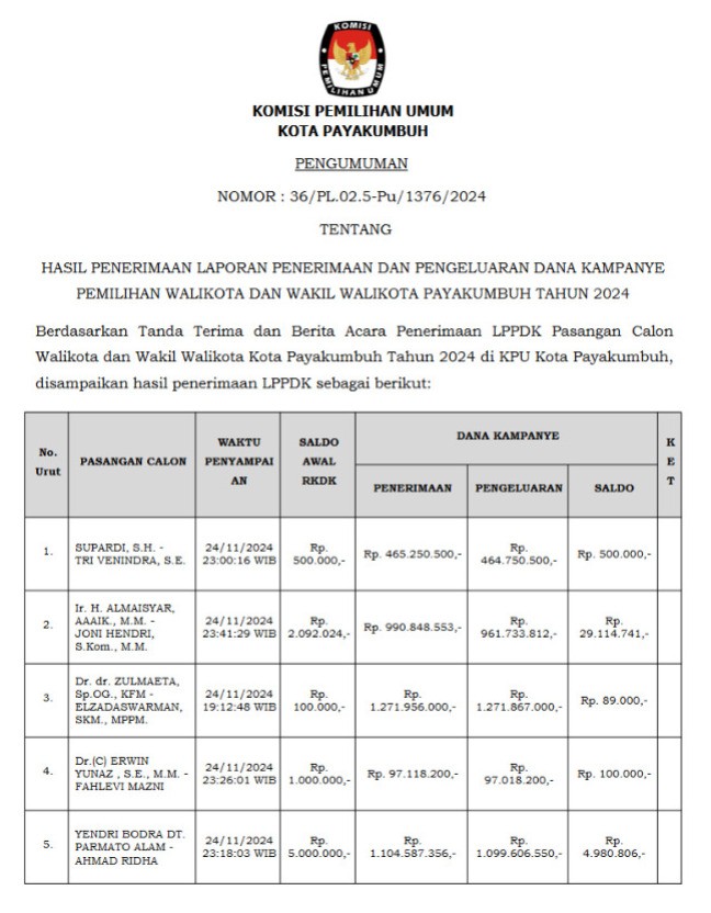 PENERIMAAN LAPORAN PENERIMAAN DAN PENGELUARAN DANA KAMPANYE PEMILIHAN WALIKOTA DAN WAKIL WALIKOTA PAYAKUMBUH TAHUN 2024