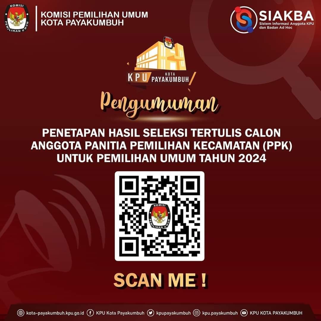 PENETAPAN HASIL SELEKSI TES TERTULIS BERBASIS CAT CALON AGGOTA PANITIA PEMILIHAN KECAMATAN (PPK) SE-KOTA PAYAKUMBUH PEMILU SERENTAK TAHUN 2024 Kamis, 08 Desember 2022 07:00 131 Pengumuman tentang Penetapan Hasil Seleksi Tes Tertulis Berbasis CAT Calon Panitia Pemilihan Kecamatan (PPK) Se-Kota Payakumbuh dalam Pemilihan Serentak 2024. Bagikan: Dilihat 131 Kali.