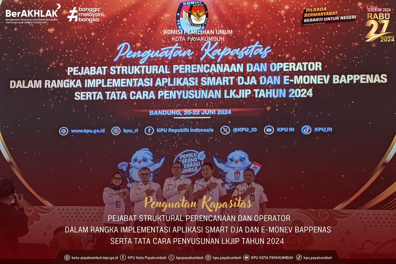 Bandung --- Kasubag Perencanaan, Data dan Informasi KPU Kota Payakumbuh M. Luthfi Munzir mengikuti Penguatan Kapasitas Pejabat Struktural Perencanaan dan Operator Dalam Rangka Implementasi Aplikasi SMART DJA dan E-MONEV BAPPENAS Serta Tata Cara Penyusunan LKJIP Tahun 2024, Kamis - Sabtu (20-22 Juni 2024) di Bandung, Jawa Barat.