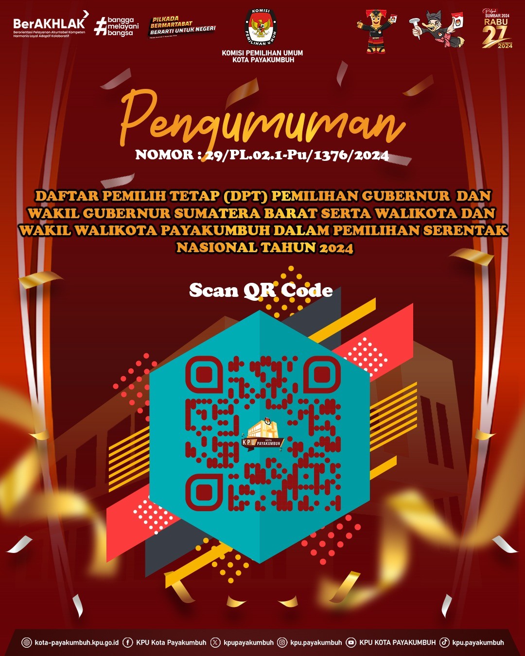 PENGUMUMAN: DAFTAR PEMILIH TETAP (DPT) PEMILIHAN GUBERNUR DAN WAKIL GUBERNUR SERTA WALIKOTA DAN WAKIL WALIKOTA PAYAKUMBUH DALAM PEMILIHAN SERENTAK NASIONAL TAHUN 2024