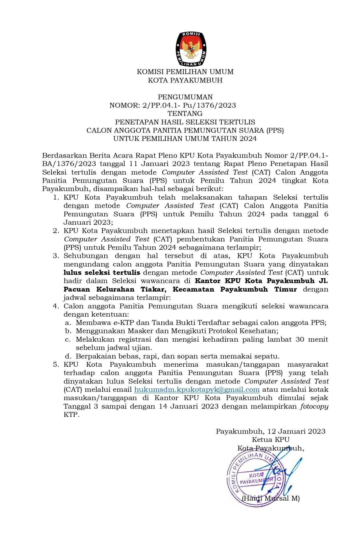 PENGUMUMAN HASIL TES TERTULIS ( C A T ) CALON PANITIA PEMUNGUTAN SUARA (PPS) SE-KOTA PAYAKUMBUH DALAM PEMILU SERENTAK 2024