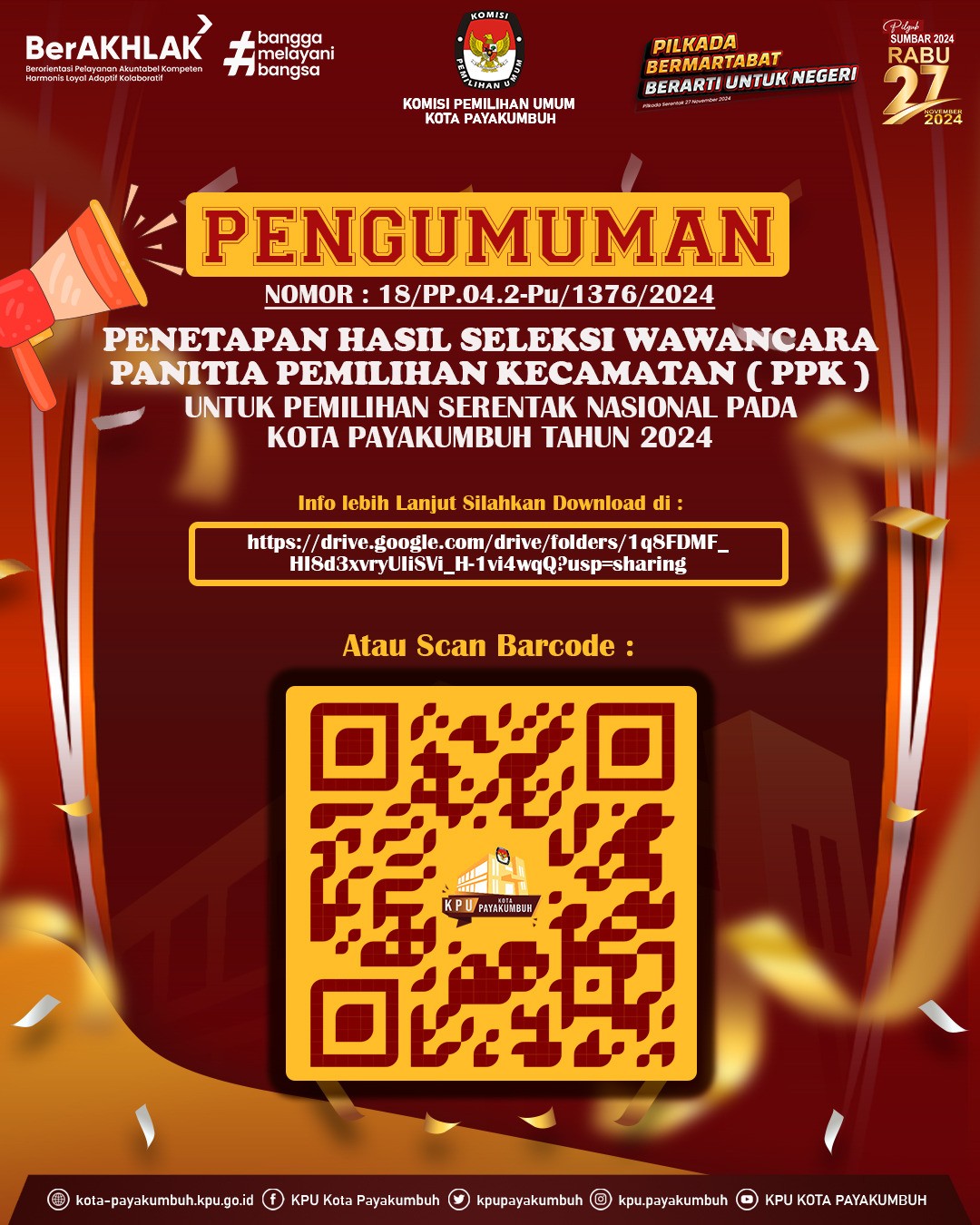 PENGUMUMAN: HASIL WAWANCARA CALON ANGGOTA PPK UNTUK PEMILIHAN SERENTAK NASIONAL PADA KOTA PAYAKUMBUH TAHUN 2024 Selasa, 14 Mei 2024 20:00 96 Berikut disampaikan Pengumuman Komisi Pemilihan Umum Kota Payakumbuh Nomor: 18/PP.04.2-Pu/1376/2024 tentang Hasil Wawancara Calon Anggota Panitia Pemilihan Kecamatan (PPK) Untuk Pemilihan Serentak Nasional Pada Kota Payakumbuh Tahun 2024 [KLIK DISINI] Bagikan: Dilihat 96 Kali.