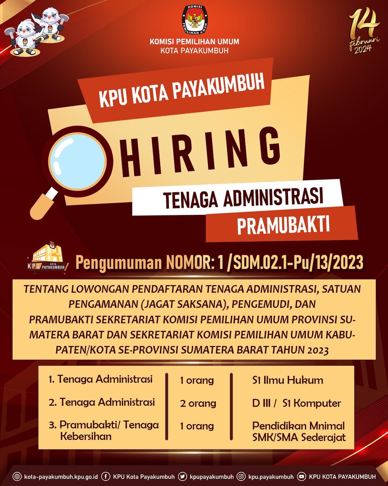 Payakumbuh --- PENGUMUMAN NOMOR: 1 /SDM.02.1-Pu/13/2023 TENTANG LOWONGAN PENDAFTARAN TENAGA ADMINISTRASI, SATUAN PENGAMANAN (JAGAT SAKSANA), PENGEMUDI, DAN PRAMUBAKTI SEKRETARIAT KOMISI PEMILIHAN UMUM PROVINSI SUMATERA BARAT DAN SEKRETARIAT KOMISI PEMILIHAN UMUM KABUPATEN/KOTA SE-PROVINSI SUMATERA BARAT TAHUN 2023