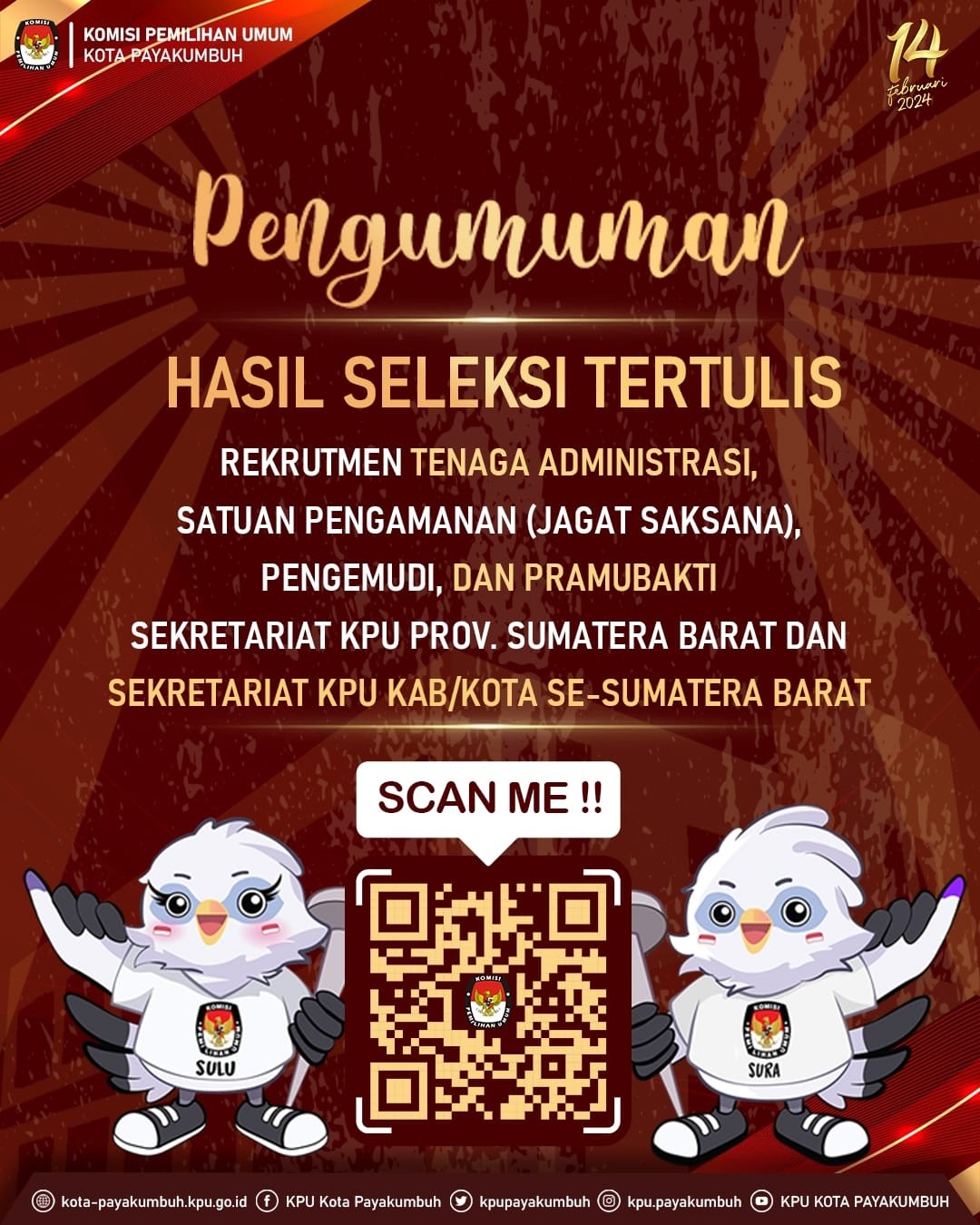 PENGUMUMAN LULUS SELEKSI TERTULIS TENAGA ADM, PENGAMANAN, PENGEMUDI, & PRAMUBAKTI DI KPU PROV/KAB/KOTA SE-SUMATERA BARAT TAHUN 2023