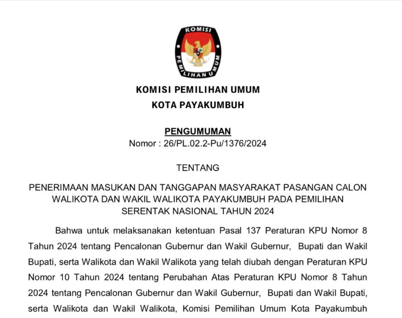 PENGUMUMAN: PENERIMAAN MASUKAN & TANGGAPAN MASYARAKAT PASANGAN CALON WALIKOTA DAN WAKIL WALIKOTA PAYAKUMBUH PADA PEMILIHAN SERENTAK NASIONAL TAHUN 2024