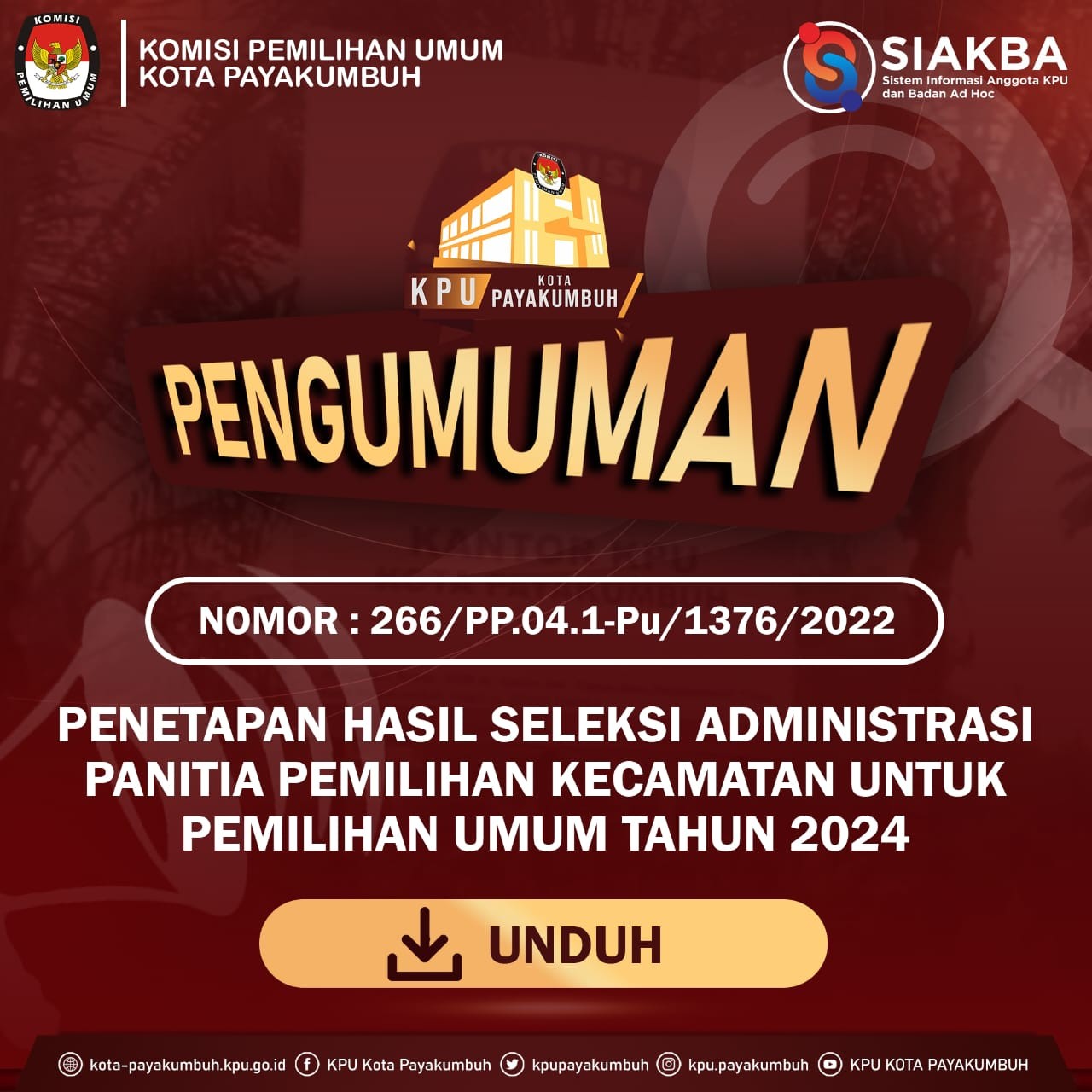 PENGUMUMAN: PENETAPAN HASIL SELEKSI ADMINISTRASI PPK UNTUK PEMILU TAHUN 2024 Jumat, 02 Desember 2022 07:00 223 Pengumuman tentang Penetapan Hasil Berkas Administrasi Calon Panitia Pemilihan Kecamatan (PPK) Se-Kota Payakumbuh dalam Pemilihan Serentak 2024. Bagikan: Dilihat 223 Kali.
