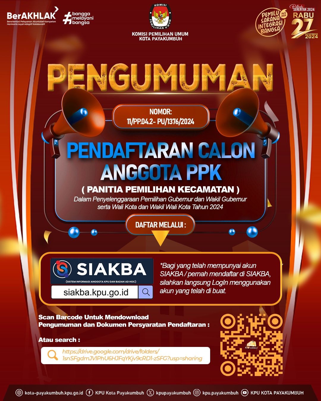 PENGUMUMAN: SELEKSI CALON ANGGOTA PANITIA PEMILIHAN KECAMATAN (PPK) UNTUK PEMILIHAN SERENTAK NASIONAL TAHUN 2024 PADA KOTA PAYAKUMBUH