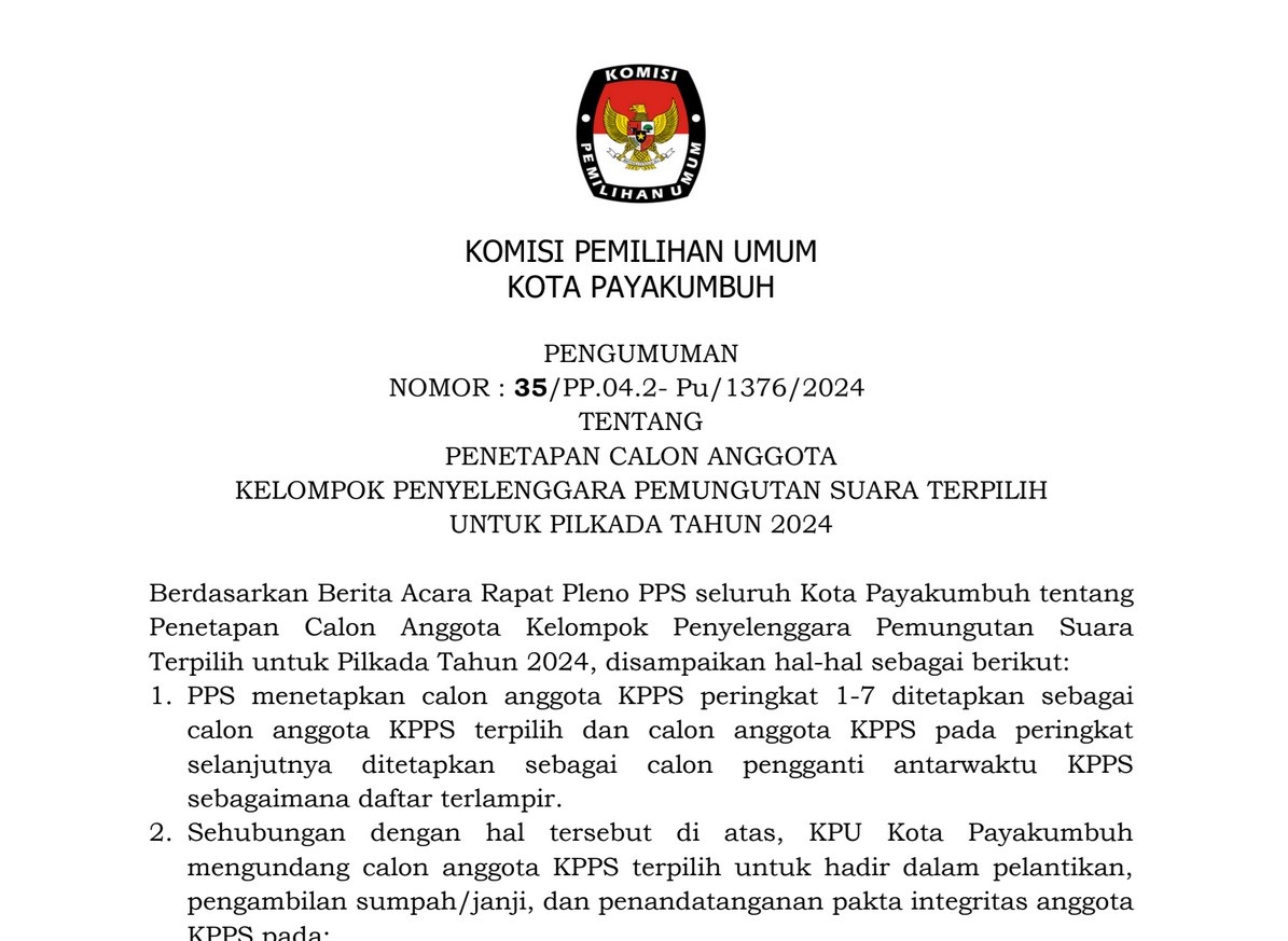 PENGUMUMAN TENTANG PENETAPAN CALON ANGGOTA KELOMPOK PENYELENGGARA PEMUNGUTAN SUARA TERPILIH UNTUK PILKADA TAHUN 2024 Kamis, 07 November 2024 09:00 419 PENGUMUMAN TENTANG PENETAPAN CALON ANGGOTA KELOMPOK PENYELENGGARA PEMUNGUTAN SUARA TERPILIH UNTUK PILKADA TAHUN 2024 KLIK DISINI Bagikan: Dilihat 419 Kali.