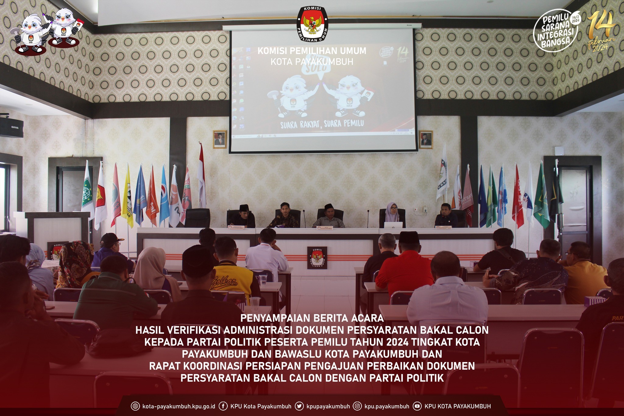 Komisi Pemilihan Umum Kota Payakumbuh mengundang partai politik peserta Pemilu Tahun 2024, Sabtu (24 Juni 2023) pagi, dalam rangka Penyampaian berita acara Hasil Verifikasi Administrasi Dokumen Persyaratan Bakal calon kepada partai politik peserta Pemilu Tahun 2024 tingkat Kota Payakumbuh dan Bawaslu Kota Payakumbuh.