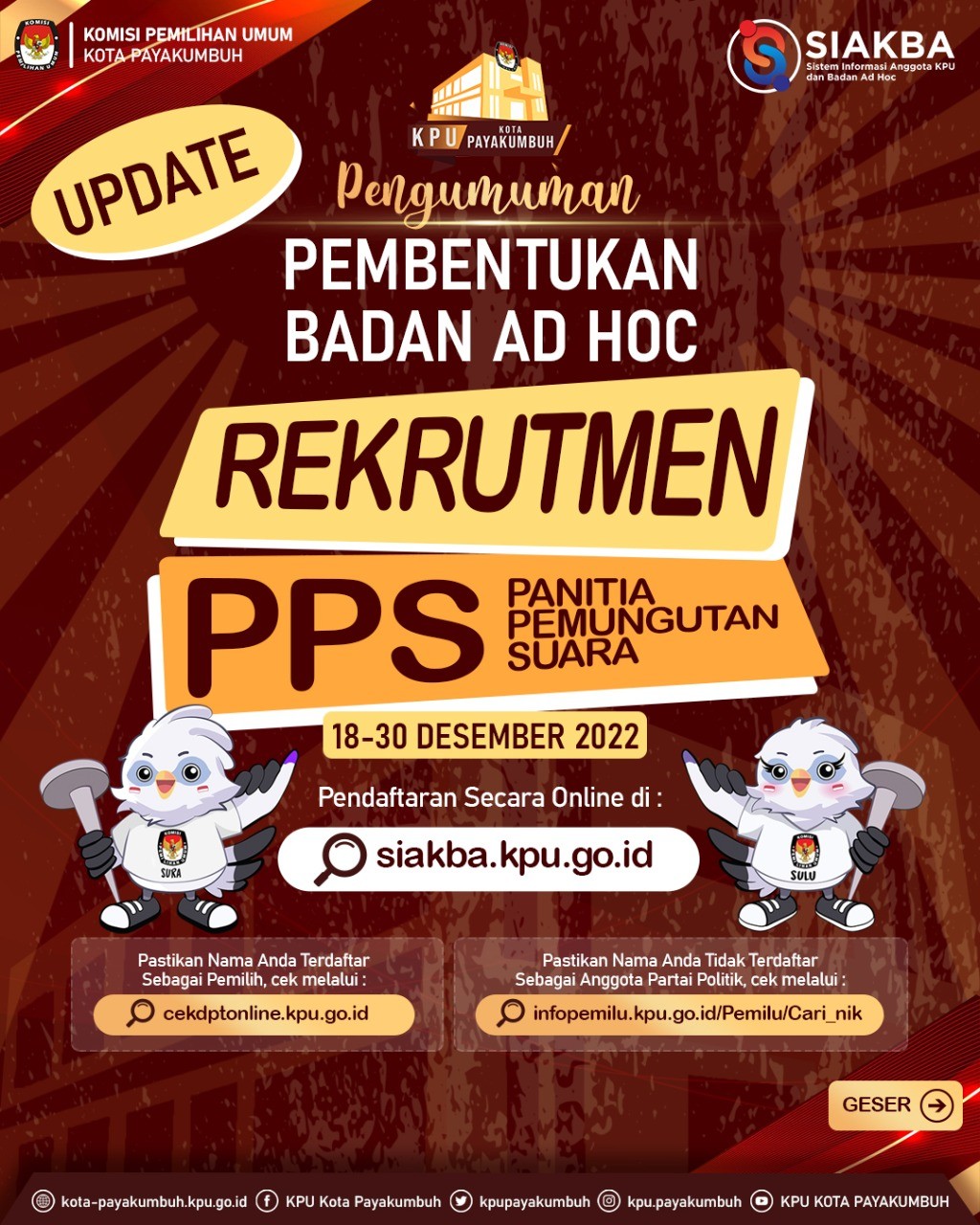 PERUBAHAN JADWAL PENDAFTARAN REKRUITMEN CALON PANITIA PEMUNGUTAN SUARA (PPS) SE - KOTA PAYAKUMBUH PEMILUS ERENTAK TAHUN 2024