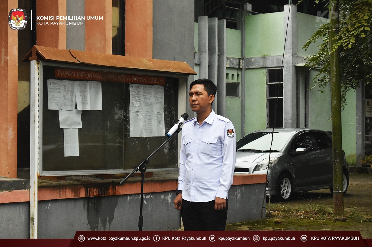 Payakumbuh --- Komisi Pemilihan Umum (KPU) telah menerbitkan Peraturan Komisi Pemilihan Umum (PKPU) Nomor 3 Tahun 2022 tentang Tahapan dan Jadwal Penyelenggaraan Pemilihan Umum Tahun 2024. PKPU yang ditetapkan di Jakarta pada 09 Juni 2022 tersebut menjadi pintu gerbang dimulainya tahapan Pemilihan Umum Tahun 2024. Hal tersebut disampaikan Sekretaris KPU Kota Payakumbuh Beni Mustika, Senin (13 Juni 2022) pagi, saat menjadi pembina apel di halaman Kantor KPU Kota Payakumbuh. Apel pagi diikuti oleh Ketua dan Anggota KPU Kota Payakumbuh, pejabat stuktural dan fungsional, serta staf sekretariat KPU Kota Payakumbuh.