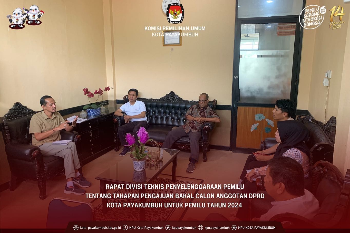 Payakumbuh --- Sesuai Peraturan Komisi Pemilihan Umum Nomor 10 Tahun 2023 tentang Pencalonan Anggota DPR, DPRD Provinsi, dan DPRD Kabupaten/Kota bahwa jadwal pengajuan bakal calon anggota DPRD Kota Payakumbuh dilaksanakan mulai Senin (1 Mei 2023) sampai Minggu (14 Mei 2023), Divisi Teknis Penyelenggaraan Pemilu melakukan rapat divisi, Jumat 28 April 2023.