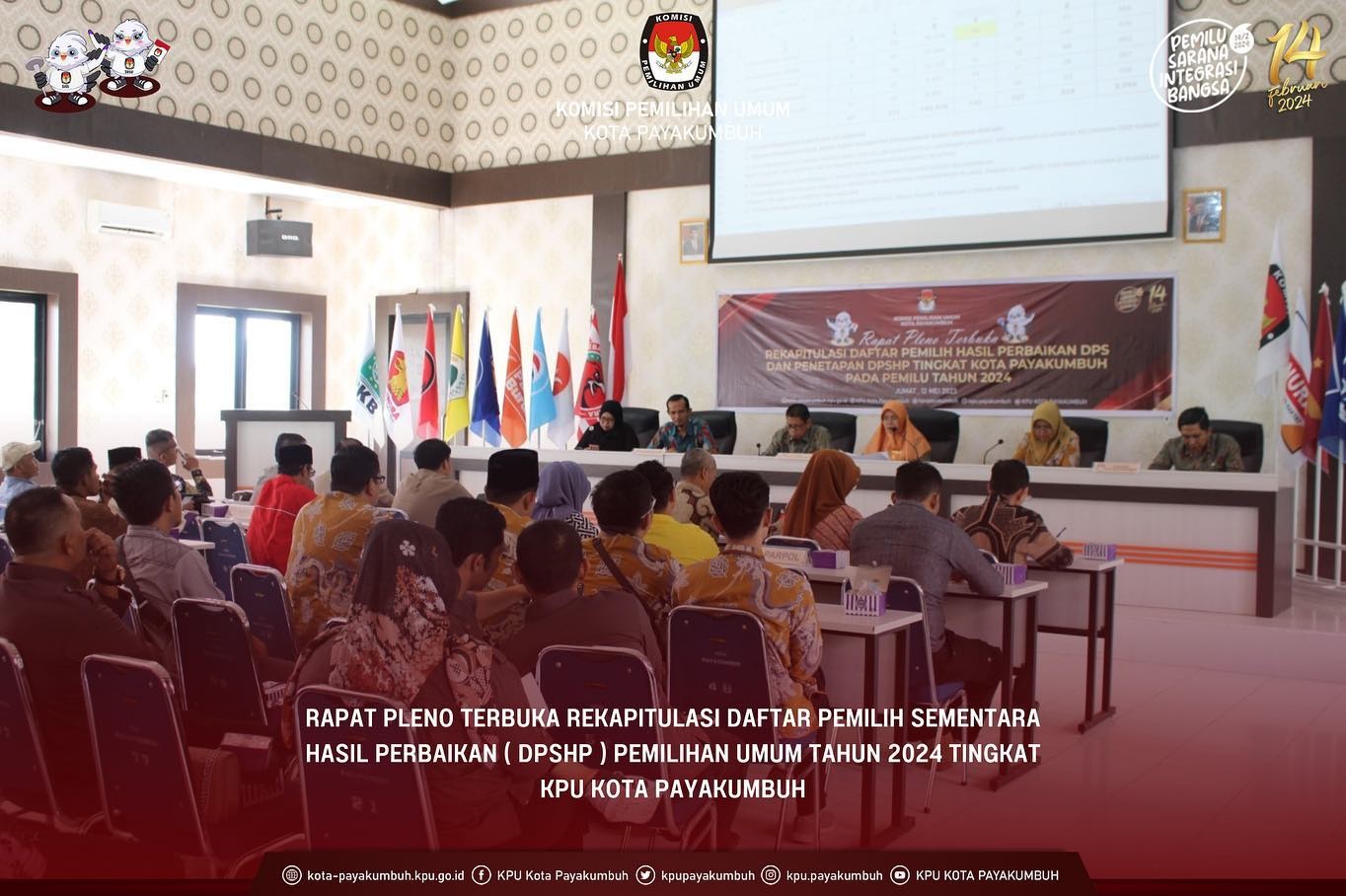 Payakumbuh --- Jumat 12 Mei 2023 dilaksanakan Rapat Pleno Terbuka Rekapitulasi Daftar Pemilih Sementara Hasil Perbaikan ( DPSHP ) PEMILIHAN UMUM TAHUN 2024 Tingkat KPU Kota Payakumbuh. Dalam rapat tersebut, KPU Kota Payakumbuh menetapkan Rekapitulasi Daftar Pemilih Hasil Perbaikan Kota Payakumbuh dengan rincian sebagai berikut.