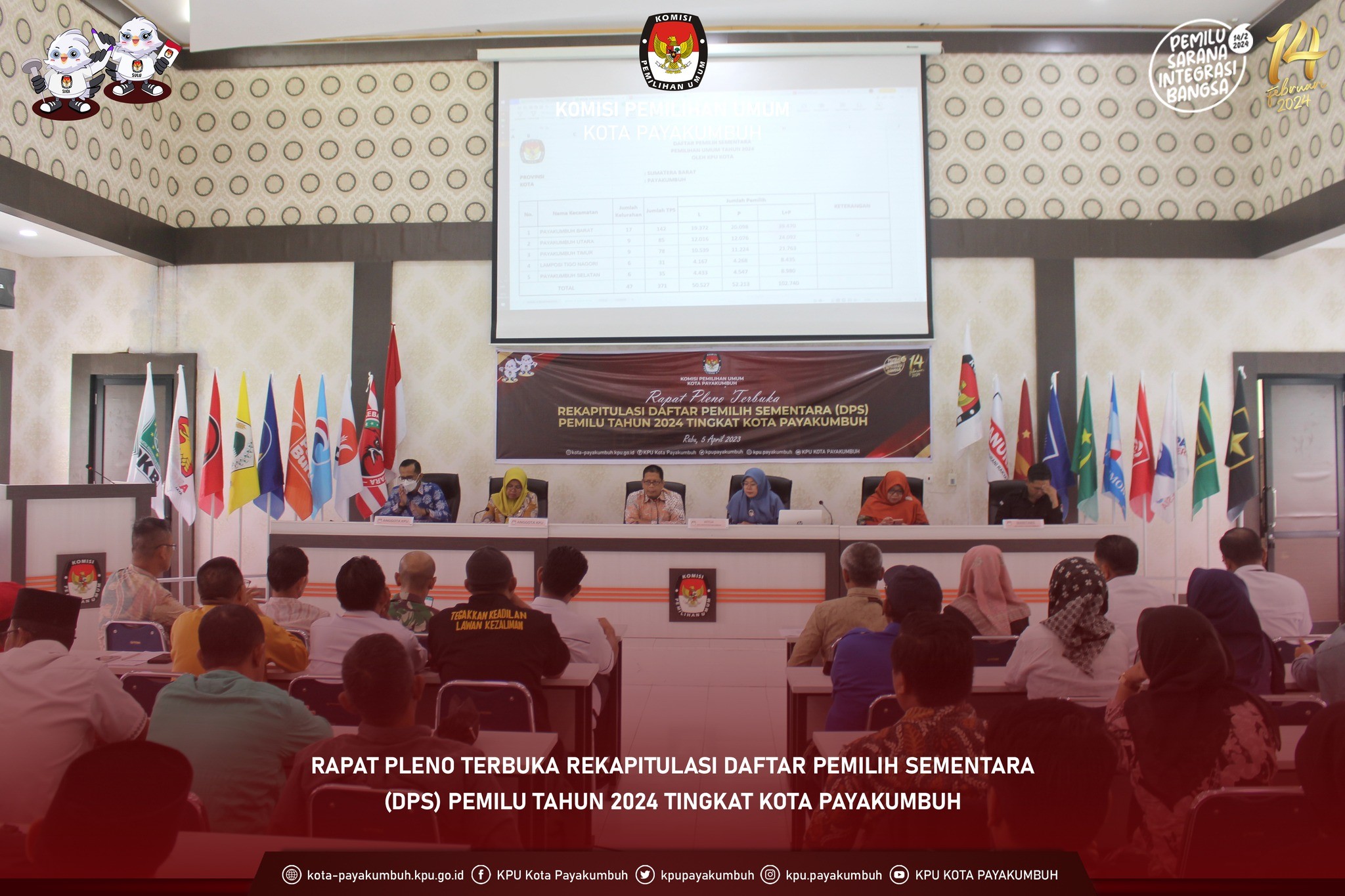 Payakumbuh --- Pada hari ini 5 April 2023, Bertempat di Aula Kantor KPU Kota Payakumbuh, KPU Kota Payakumbuh telah melaksanakan Rapat Pleno Terbuka Rekapitulasi Daftar Pemilih Hasil Pemutakhiran dan Penetapan Daftar Pemilih Sementara (DPS) Tingkat Kota Payakumbuh pada Pemilu tahun 2024.