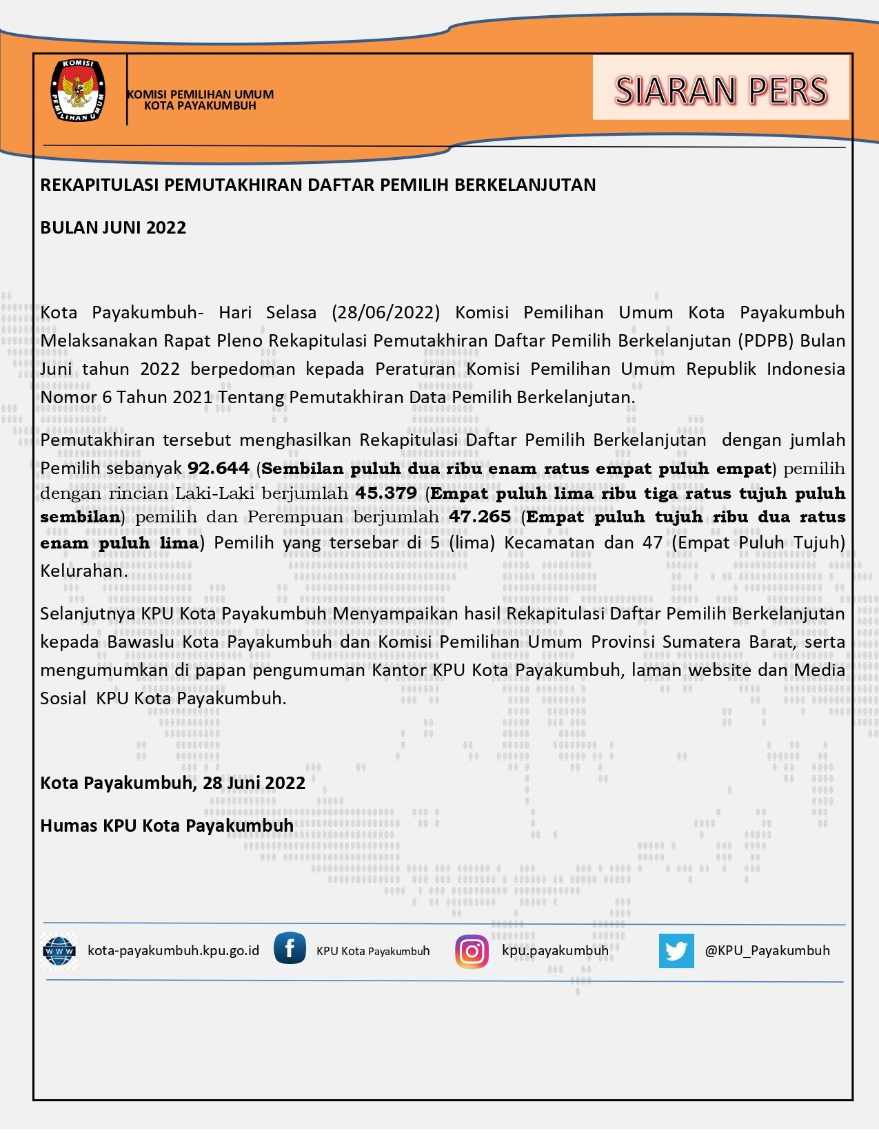 Pada hari ini Selasa tanggal Dua Puluh Delapan bulan Juni Tahun Dua Ribu Dua Puluh Dua, Komisi Pernilihan Umum Kota Payakumbuh telah melaksanakan Rapat Pleno Rekapitulasi Daftar Pemilih Berkelanjutan periode bulan Juni tahun 2022 di tingkat Kota Payakumbuh.
