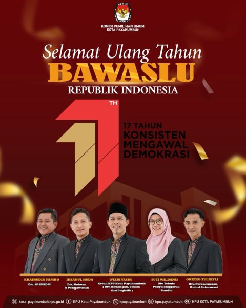 Hallo #TemanPemilih, KPU Kota Payakumbuh mengucapkan selamat ulang tahun kepada Bawaslu yang senantiasa konsisten mengawal demokrasi, menjaga integritas pemilu, dan menjadi mitra strategis dalam mewujudkan pemilu yang jujur, adil, dan berkeadaban.