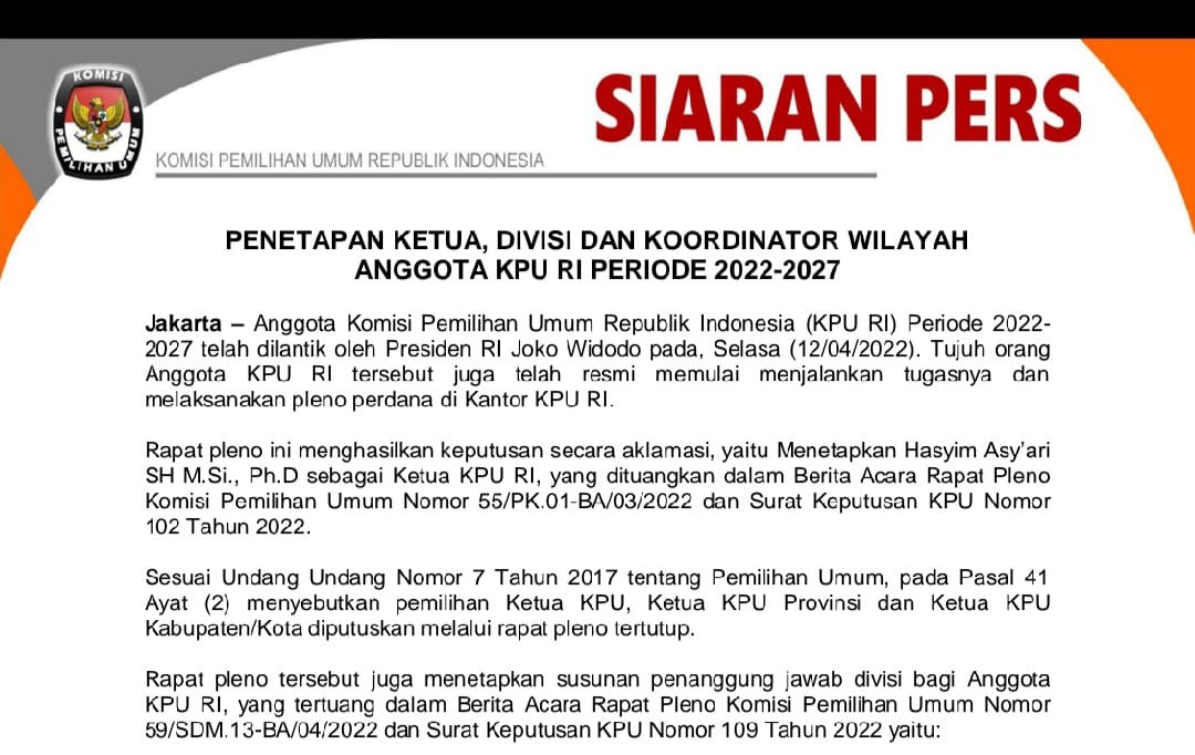 Siaran Pers KPU RI Jumat, 15 April 2022 00:00 416 Siaran Pers Komisi Pemilihan Umum Republik Indonesia tentang Penetapan Ketua, Divisi dan Koordinator Wilayah Anggota KPU RI Periode 2022 - 2027 Bagikan: Dilihat 416 Kali.