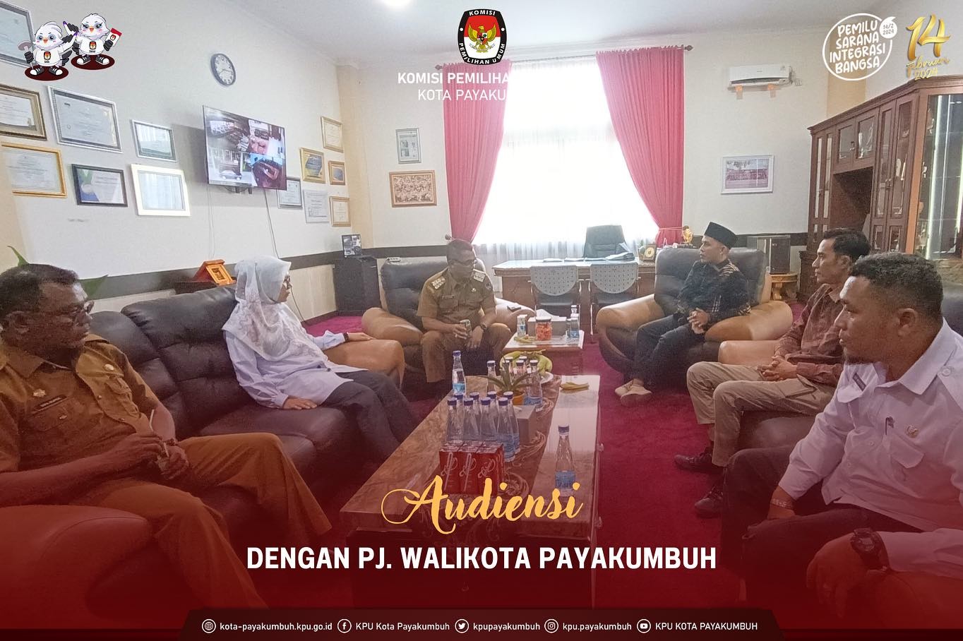 Payakumbuh --- Peran serta Pemerintah dan Pemda dalam menyukseskan proses penyelenggaraan pemilu sangatlah penting , Senin (7/8), Sesuai dengan Surat KPU Provinsi Sumatera Barat Nomor 334/HM.01.2-UND/13/2023 tanggal 31 Juli 2023 Perihal Dukungan Pemerintah Kabupaten/ Kota pada Pemilu Serentak Tahun 2024, KPU Kota Payakumbuh yang dipimpin langsung oleh Ketua KPU Kota Payakumbuh Wizry Yasir didampingi oleh Ketua Divisi Teknis Penyelenggaraan Suci Wildanis, Ketua Divisi Perencanaan Data dan Informasi Orisko Zulkifli serta Staff Adri Mayce dan Debi Martiven melakukan Silaturahmi dalam rangka beraudiensi dengan Pj. Walikota Payakumbuh diruang kerjanya.