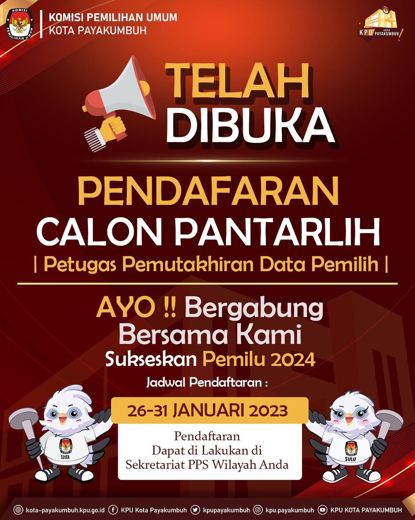 Di mulai dari tanggal 26 Januari 2023 s/d 31 Januari 2023 . Ayoo segera daftarkan diri di Sekretariat PPS wilayah masing-masing.