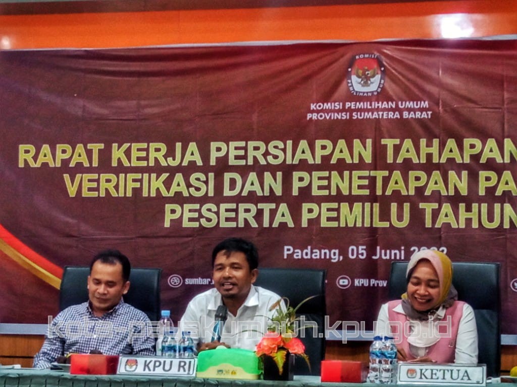 Padang --- Tahapan Pemilihan Umum serentak Tahun 2024 semakin dekat. Komisi Pemilihan Umum (KPU) mengingatkan jajarannya untuk bersiap menghadapi tahapan demi tahapan tersebut dengan memperbaharui semangat dan mindset untuk bekerja menyukseskan Pemilu serentak, 14 Februari 2024. Hal tersebut disampaikan Anggota KPU RI Idham Holik di hadapan KPU Provinsi dan Kabupaten/Kota se-Sumatera Barat saat rapat kerja Persiapan Tahapan Pendaftaran, Verifikasi dan Penetapan Partai Politik Peserta Pemilu Tahun 2024, Minggu (05 Juni 2022) siang di Aula KPU Provinsi Sumatera Barat.