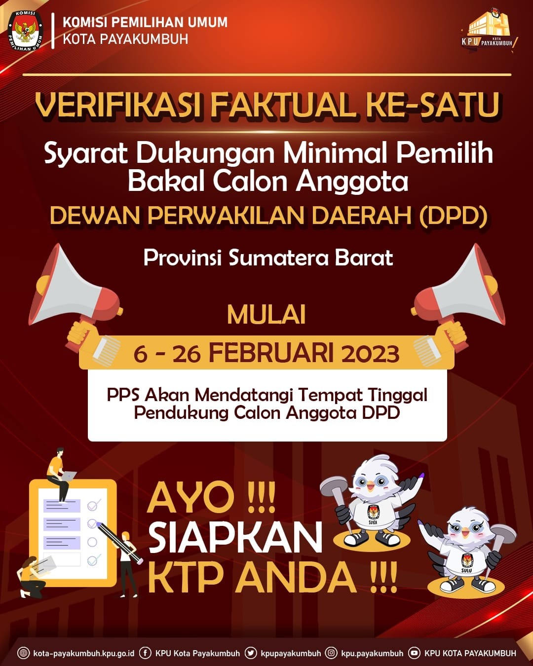 Payakumbuh --- Hallo Warga Kota Payakumbuh, Verifikasi Faktual Kesatu Sayarat Dukungan Minimal pemilih Bakal Calon Anggota Dewan Perwakilan Daerah (DPD) Provinsi Sumatera Barat dimulai pada Hari Senin, 6 Februari 2023 sampai Hari Minggu, 26 Februari 2023. Bagi anda para pendukung bakal calon anggopta DPD, Yuk persiapkan diri dan identitas diri (Kartu Tanda Penduduk/KTP elektronik) untuk diverifikasi oleh Panitia Pemungutan Suara (PPS).